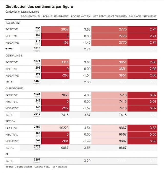 Commençons par le tableau. À l’aide d’un lexique moderne de sentiment en français (FEEL), appliqué à des milliers de segments mentionnant explicitement quatre figures clés — Toussaint Louverture, Jean‑Jacques Dessalines, Henri Christophe et Alexandre Pétion — nous avons classé les passages comme positifs, neutres ou négatifs et calculé des agrégats. Ces proxys quantitatifs ne « remplacent » pas la lecture fine ; ils l’ordonnent. Ce qui émerge n’est pas la trace fumante d’un favoritisme, mais un paysage de variations tonales modestes.