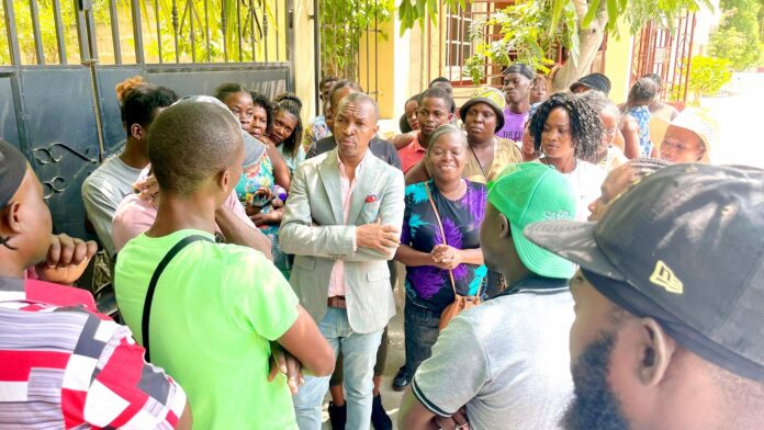 L’avocat Evel Fanfan avec les travailleurs révoqués. Le 9 novembre 2023, Apaid a fermé son usine, laissant plus de 1500 ouvriers dans le chômage. “Nous sommes ici pour dénoncer l’État haïtien, qui agit contre les travailleurs et défend les intérêts des employeurs.”