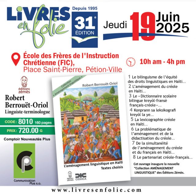 En dépit de son cortège de morts et de personnes déplacées, malgré l’insécurité et la désertion des écoles qui caractérisent le « chaos haïtien », plusieurs éditeurs de livres de référence et de manuels scolaires sont parvenus à produire des ouvrages de grande qualité. Ainsi, les Éditions Zémès présenteront au public, le 19 juin 2025, à Livres en folie, plusieurs de ses plus récentes publications, notamment « L’aménagement linguistique en Haïti / Textes choisis » de Robert Berrouët-Oriol, linguiste-terminologue et spécialiste de l’aménagement linguistique, ainsi que « La construction du sens dans les textes musicaux en créole haïtien », ouvrage collectif élaboré sous la direction de Molès Paul, linguiste-sémanticien et enseignant-chercheur à la Faculté de linguistique appliquée de l’Université d’État d’Haïti.